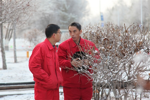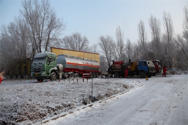 擺放設(shè)備、連接管線、查看壓力、點火加熱、起泵循環(huán)。。。一切工作都在井然有序的進(jìn)行著,冰涼的管線慢慢有了溫度,回水的溫度也達(dá)到了預(yù)期的目標(biāo),大家的臉上都露出了勝利的笑容。我們知道為了保證管線中的溫度能平穩(wěn)的維持在一定范圍內(nèi),就要求打循環(huán)的熱油車要24小時不間斷的連續(xù)施工,每一位操作人員必須也要堅守在崗位上,隨時觀察壓力、溫度的變化。連著熬了幾天,每個人都是疲憊不堪,可是為了讓準(zhǔn)東人民都不受凍,大家付出再多的辛勤也是值得的!