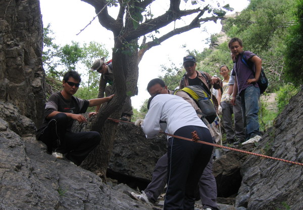 接下來就是最后一段路程了,這一段路程也是比較艱難的,中間有好幾處都是需要大家團(tuán)結(jié)協(xié)作才能過去的險(xiǎn)境。在大家的相互幫助下,我們有驚無險(xiǎn)的穿越了幾處險(xiǎn)境,下到山腳下時(shí),每個(gè)人都非常激動(dòng),一是因?yàn)槲覀儜?zhàn)勝了自己,終于完成了此次艱險(xiǎn)的路程,二是因?yàn)轳R上就可以看到我們的車了,馬上可以去吃飯了。這是大家的步伐也變得輕盈了。