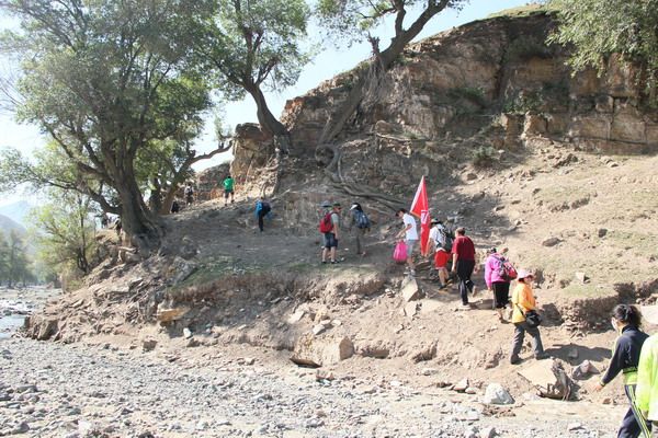 大約兩三公里的鵝卵石路總算走完了,隊伍拐進(jìn)了小馬圈溝。小馬圈溝名氣不小,給人一種深山美景的幻覺。可能是期望值太高的緣故,實(shí)地一看難免有些失望,兩邊是光禿禿的山,溝里的樹倒是不少,可偏偏長在旁邊,遮不了頭上的太陽。路上沒了鵝卵石,可滿是沙土的路同樣不好走,一個勁兒的上坡路,幾乎就沒有平整的一段,逼使我們一個勁兒地爬。太陽又大得可以,曬得人滿頭火辣辣。終于看到了一大片白楊林,領(lǐng)隊說那就是今天的午休地。望而生畏,白楊林掛在半山腰,要到那里,必須爬上一架高坡,已經(jīng)氣喘吁吁的隊伍,再經(jīng)這一折磨,肯定夠受的。好在大伙兒情緒不錯,那就沖,年輕人輕而易舉就沖上去了,體弱的只有慢慢往上爬。一想也該這樣,戶外運(yùn)動就是一種鍛煉,不是來旅游享福的,既然是鍛煉,能不辛苦么!