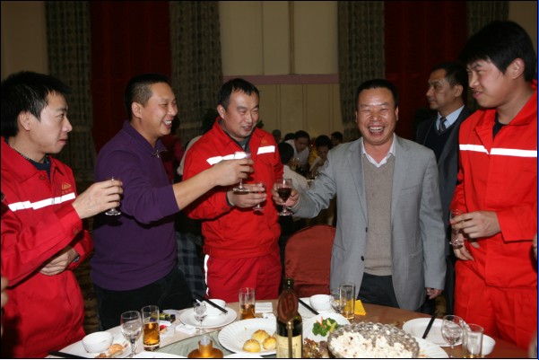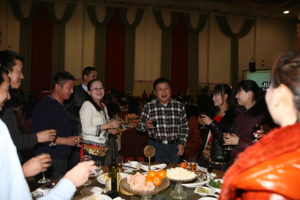 有句古話叫“無酒不成席”,今天更是如此。平時(shí)要上班,要開車,酒是不能喝的,今天有了開懷痛飲的機(jī)會(huì),又逢如此高興的日子,那興奮勁兒就不必說了。秦總、常總、王總一桌一桌的敬酒,各種感謝和祝福的話語表達(dá)了領(lǐng)導(dǎo)的深切關(guān)懷,走一桌就坐下來聊一會(huì)兒,聊這一年的付出,聊這一年的困難,聊這一年的收獲。公司其他領(lǐng)導(dǎo)也一一到各桌和員工們喝酒,帶去問候和祝福。員工們的互敬當(dāng)然更熱鬧,整個(gè)大廳觥籌交錯(cuò),歡呼聲不絕于耳。